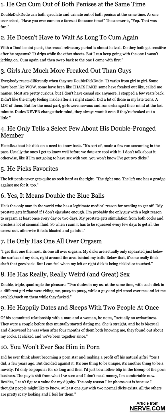 Being born with a deformity is horrible, until you consider the possibility of having two big fully functioning cocks. In that case, it's winning the genetic lottery and gaining super human sexual abilities at birth. Finally a hero the internet deserves. Read more